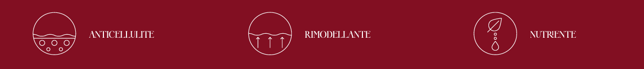 Olio Abissinia, Ippocastano estratto, Edera estratto, Centella Asiatica estratto, Capsico (Peperoncino Rosso) estratto, Rosmarino olio essenziale, Arancio Amaro olio essenziale, olio Vinaccioli, olio Karitè, Vitamina E.