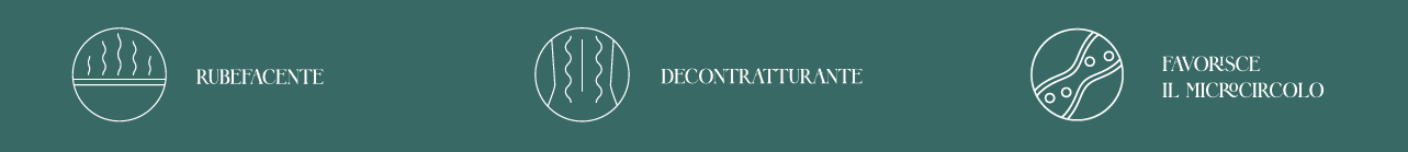 Rubefacente. Favorisce la circolazione sanguigna. Utile nei massaggi sportivi, come trattamento dei fastidi articolari o nelle contratture. Dona un piacevole effetto caldo sulla pelle.